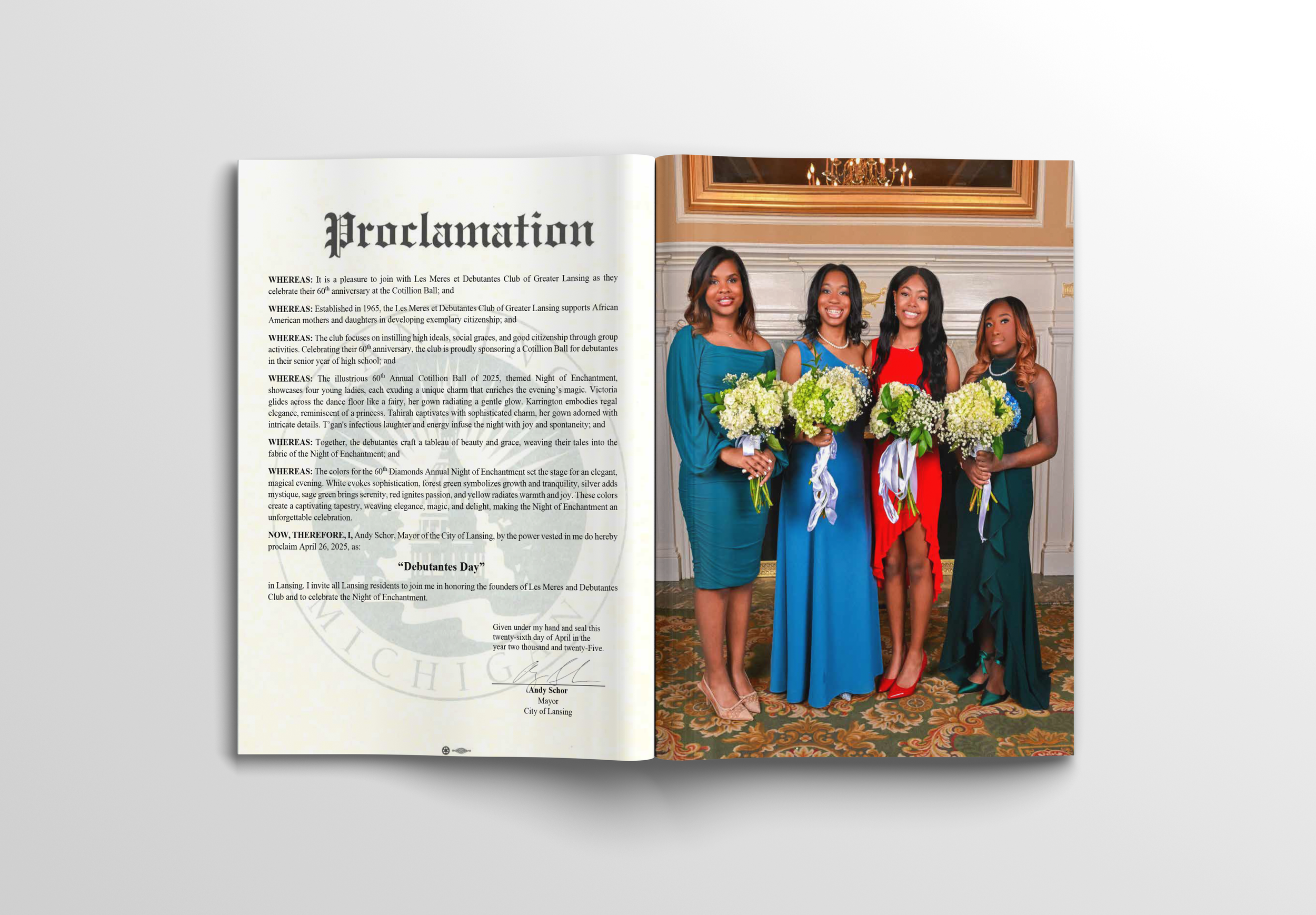 Established in 1965, the Les Meres et Debutantes Club of Greater Lansing is a community of African-American mothers and daughters dedicated to nurturing the transformation of their daughters into exceptional citizens through our guidance and positive influence. Les Meres et Debutantes Club of Greater Lansing aims to cultivate high ideals and character traits during their formative years, while also guiding them in the acquisition of social graces and good citizenship through group activities. The organization fosters understanding and friendship among its members, and proudly sponsors a Cotillion Ball for debutantes in their twelfth-grade year. The 2025 cotillion ball, A Night of Enchantment, marked the 60th anniversary of the club.