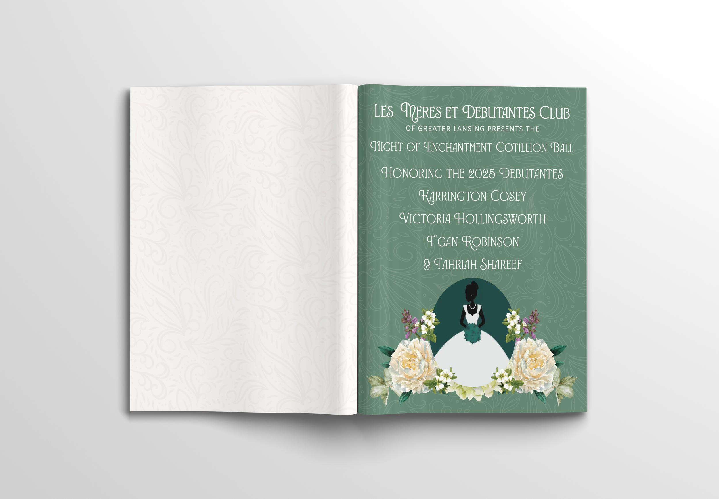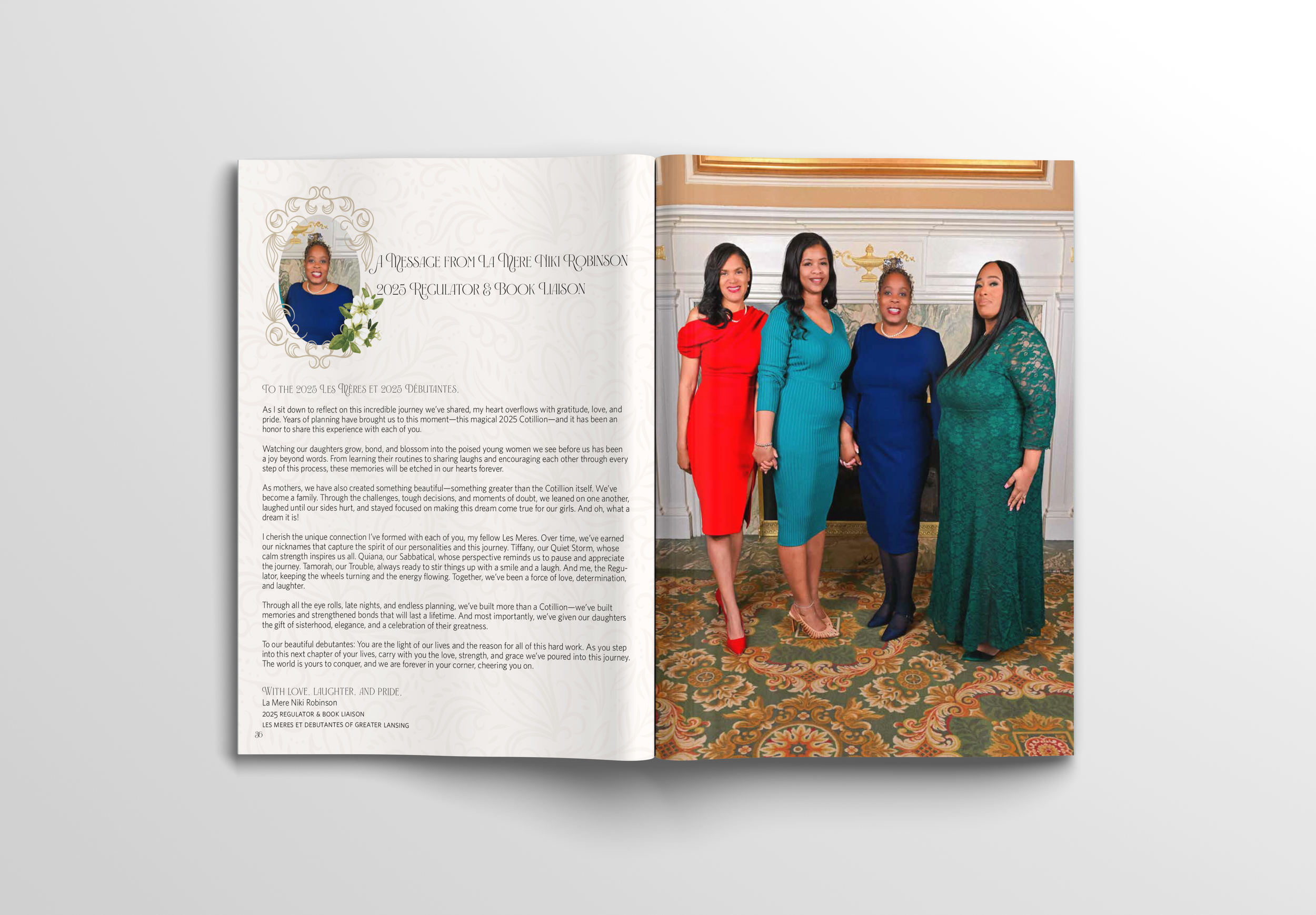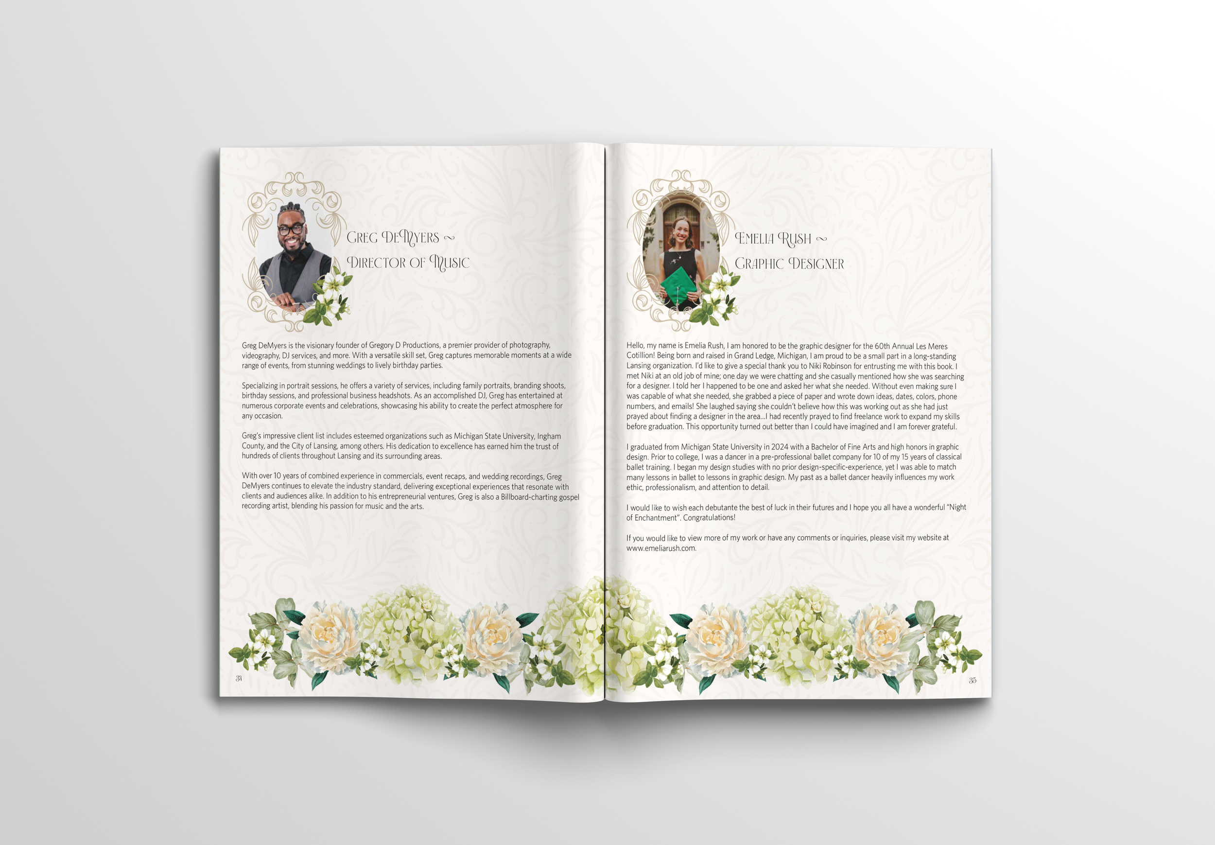 Over the course of six months, I created a “souvenir book” for the 60th anniversary of the Les Meres et Debutantes Club of Greater Lansing. I was in charge of sourcing and editing decades old photos, typesetting, designing, and printing said book (the final product is 200 pages, perfect bound on satin paper). I worked closely with the mothers and advisors of the 2025 debutantes, to ensure their visions of a “bold and beautiful anniversary” were brought to life. Each attendant of the cotillion ball, roughly 150 people, received their own copy of the book to remember the enchanted evening.