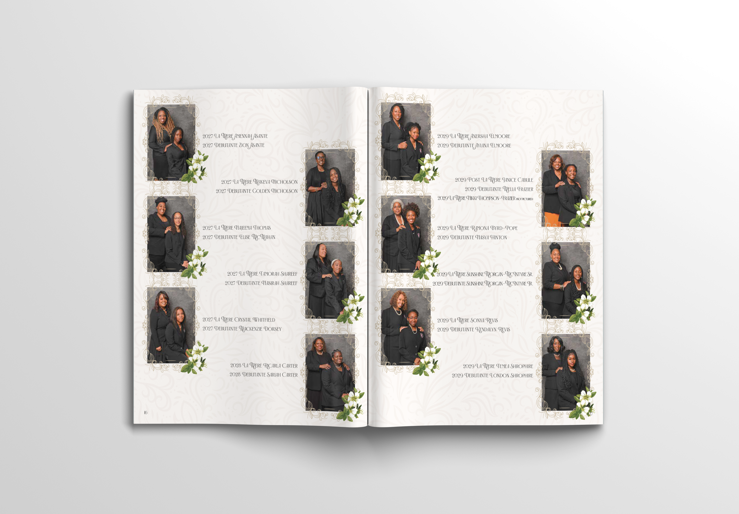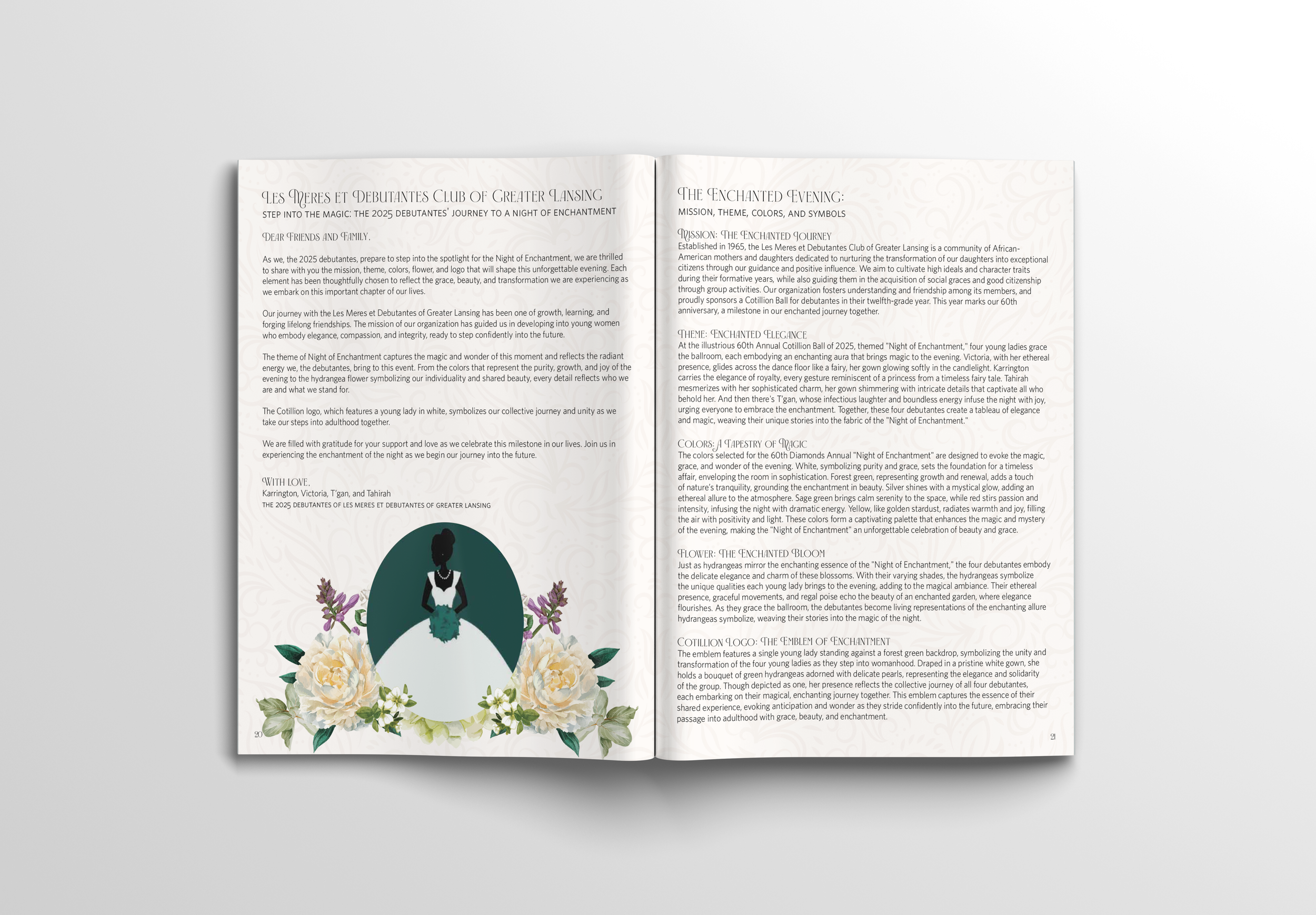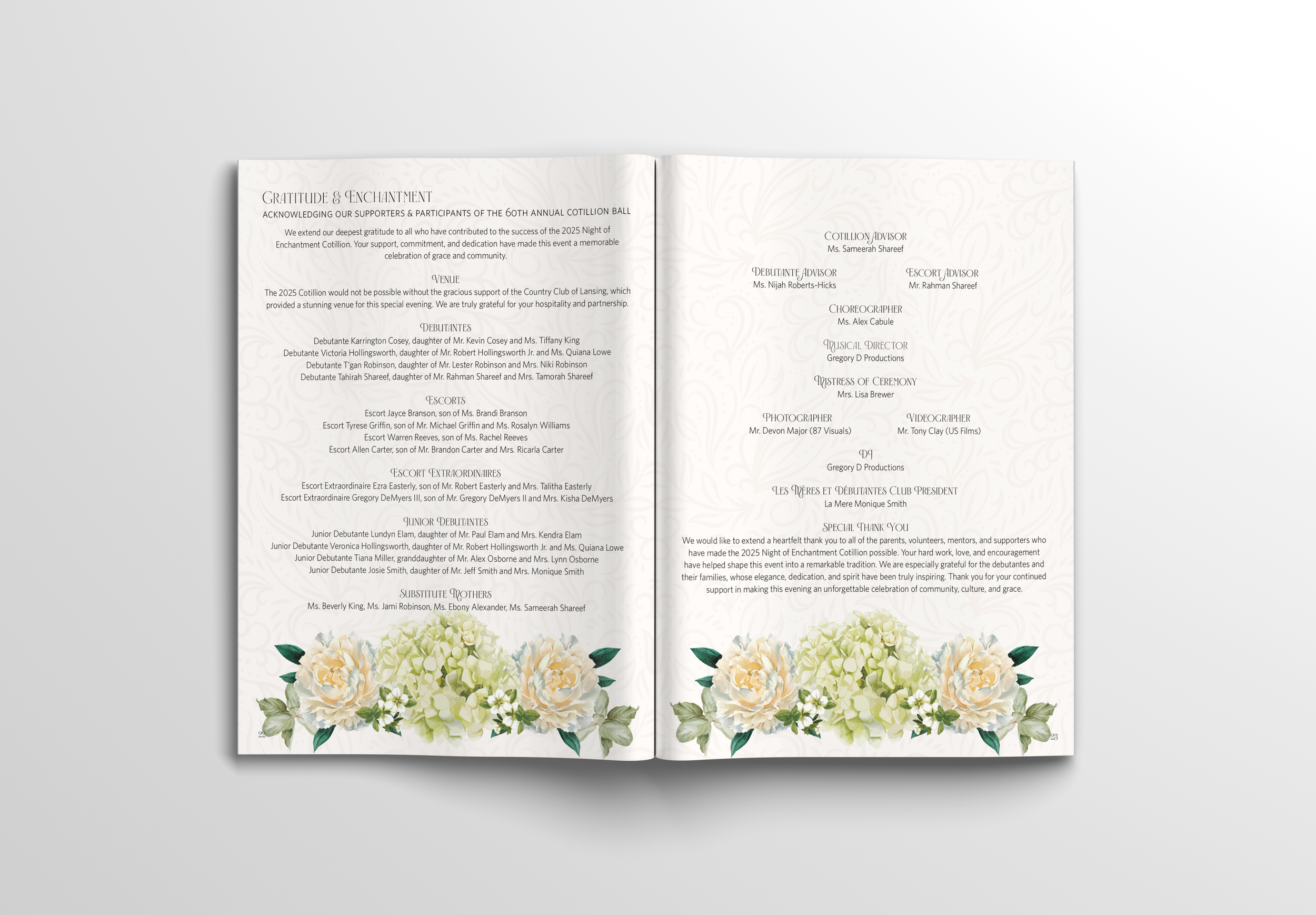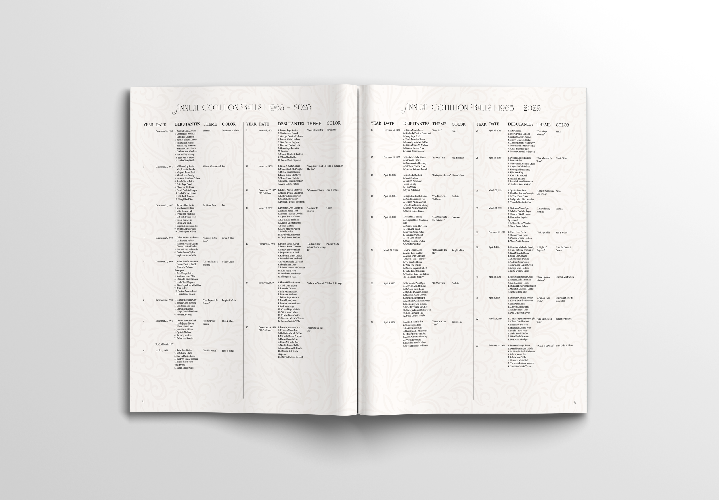 Over the course of six months, I created a “souvenir book” for the 60th anniversary of the Les Meres et Debutantes Club of Greater Lansing. I was in charge of sourcing and editing decades old photos, typesetting, designing, and printing said book (the final product is 200 pages, perfect bound on satin paper). I worked closely with the mothers and advisors of the 2025 debutantes, to ensure their visions of a “bold and beautiful anniversary” were brought to life. Each attendant of the cotillion ball, roughly 150 people, received their own copy of the book to remember the enchanted evening.